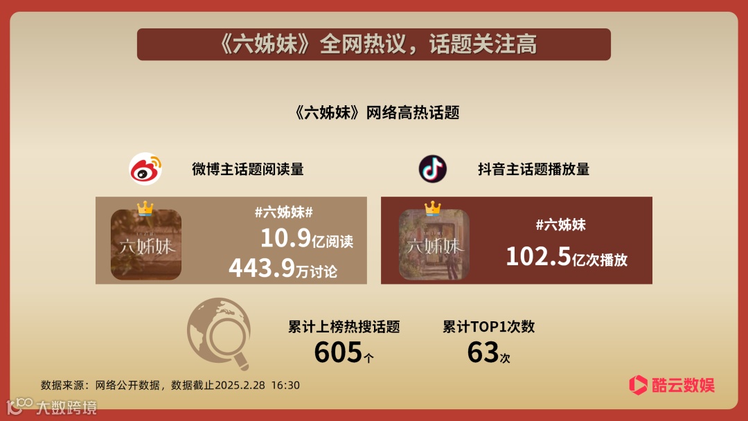 在社交平台上《六姊妹》相关话题讨论热度居高不下,仅在微博与抖音平台#六姊妹#话题阅读量就超百亿,上榜热搜605次,剧中#六姊妹哭麻了##六姊妹大姐回怼这16秒#等话题更是引发全网热议。