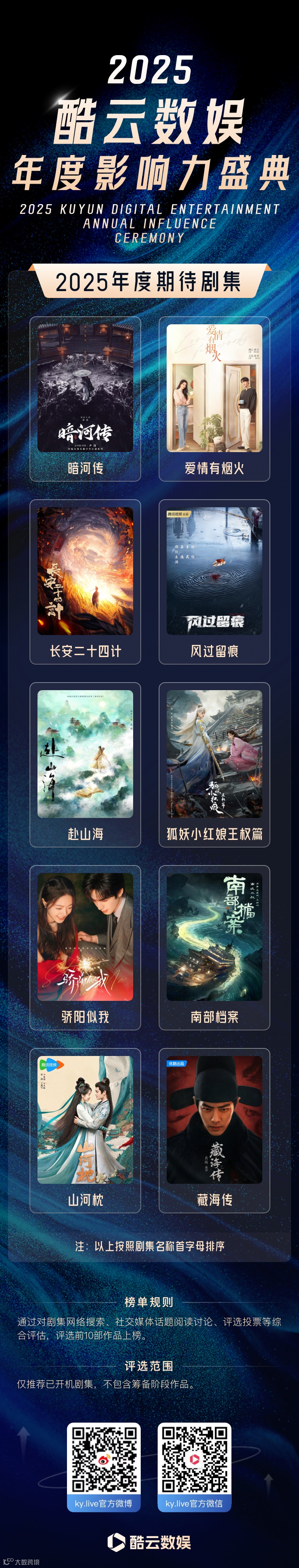 《暗河传》《爱情有烟火》《长安二十四计》《风过留痕》《赴山海》《狐妖小红娘王权篇》《骄阳似我》《南部档案》《山河枕》《藏海传》入选“2025年度期待剧集”榜单。