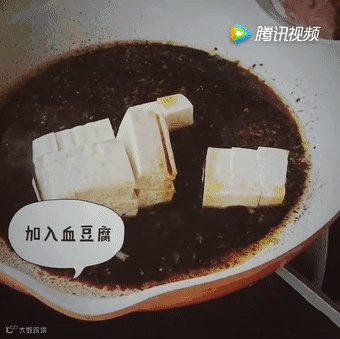 3、倒入猪血和豆腐,拌匀,盖上锅盖,小火煮5—8分钟。