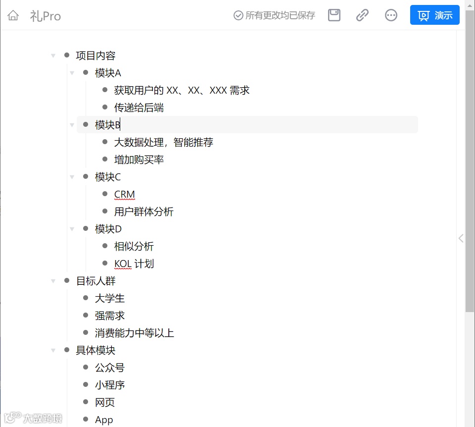 当线性先后结构变得重要、整体内容需要按顺序讲述的时候,我一般会使用坚果云大纲笔记 来完成内容的梳理。大纲笔记与思维导图类似,也注重内容的逻辑,层级思想的渗透对于内容的思考也很有帮助。