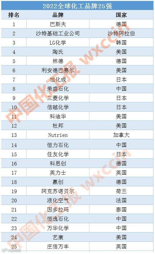 中国化工品牌有4个进入25强,并且首进前十强。荣盛石化位居第8位,恒力石化位居14位,恒逸石化位居22位,万华化学位居23位。