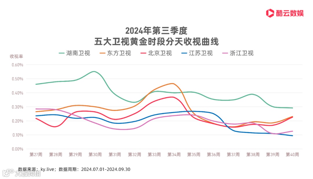 从Q3五大卫视黄金时段分天收视曲线来看,Q3卫视收视率呈现曲线下降趋势,季中多部热门剧集播出,收视率增量明显。