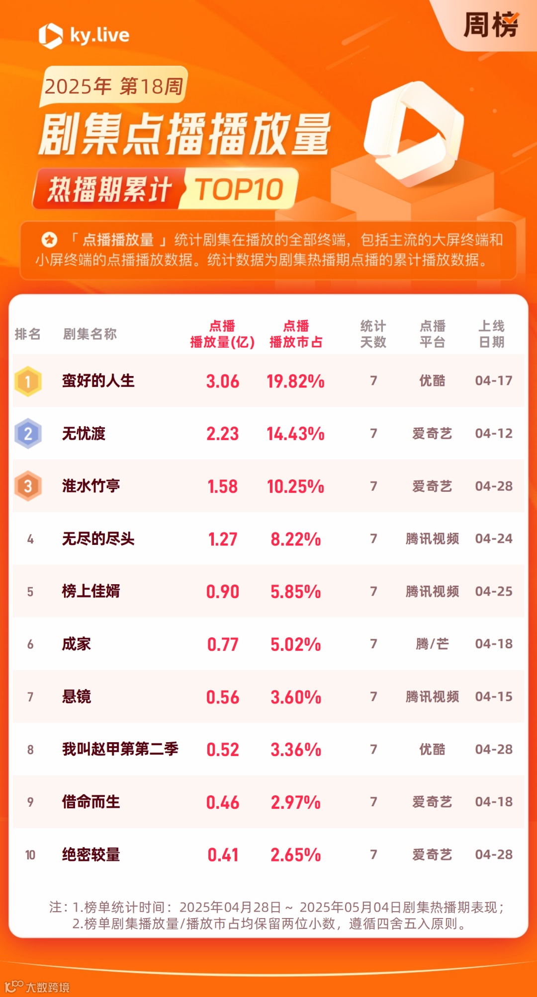 由孙俪、董子健主演的《蛮好的人生》全端播放量持续领跑,上周累计全端播放量7.11亿蝉联第18周全端播放量周榜冠军。同时剧集上周点播播放量3.06亿,获得第18周点播播放量周冠。