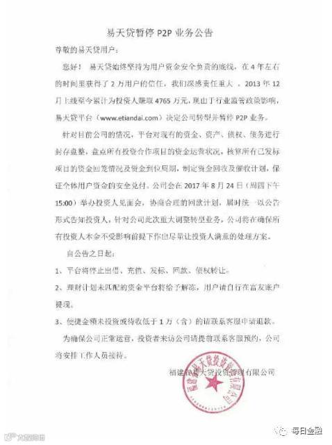 就在今天(8月23日)早上,福建P2P平台易天贷发布公告称,由于无法通过金融办备案,经过慎重考虑,公司决定清盘P2P业务。易天贷还专门安抚投资人,称公司回收的出借金融能够覆盖当前代收金融,请投资人理性看待平台清盘,并公布了投友咨询QQ群。
