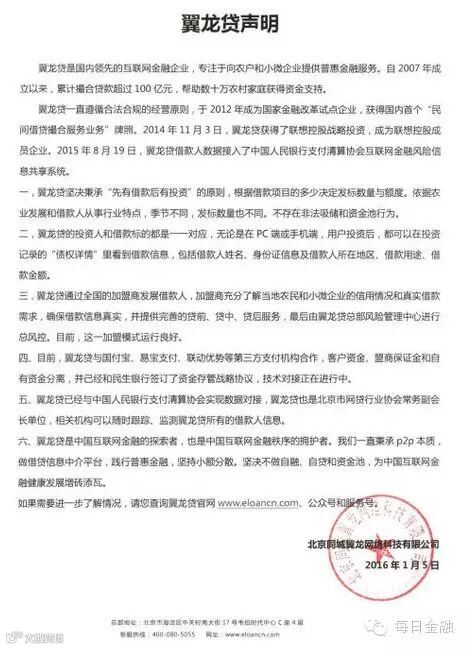 报道出来之后,翼龙贷运营总监吕建军表示,“先有债券后放贷”正是翼龙贷的长处。5日晚间,翼龙贷亦发布官方声明,称公司一直坚决秉承“先有借款后有投资”的原则,根据借款项目的多少决定发标数量与额度。依据农业发展和借款人从事行业特点,季节不同,发标数量也不同。不存在非法吸储和资金池行为。
