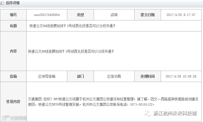 交通集团:您好!BRT快速公交线属于杭州公交集团公司建设和经营管理;据了解,因文一西路高架快速路规划建设原因,快速公交BRT6号线暂缓实施。杭州市公交集团公司联系电话:0571-85191122。