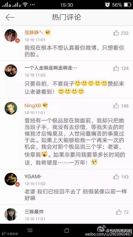 自从@我的前任是极品 国民老婆的皂片粗现之后,,,哈哈哈不管她发什么,评论是这样的了: