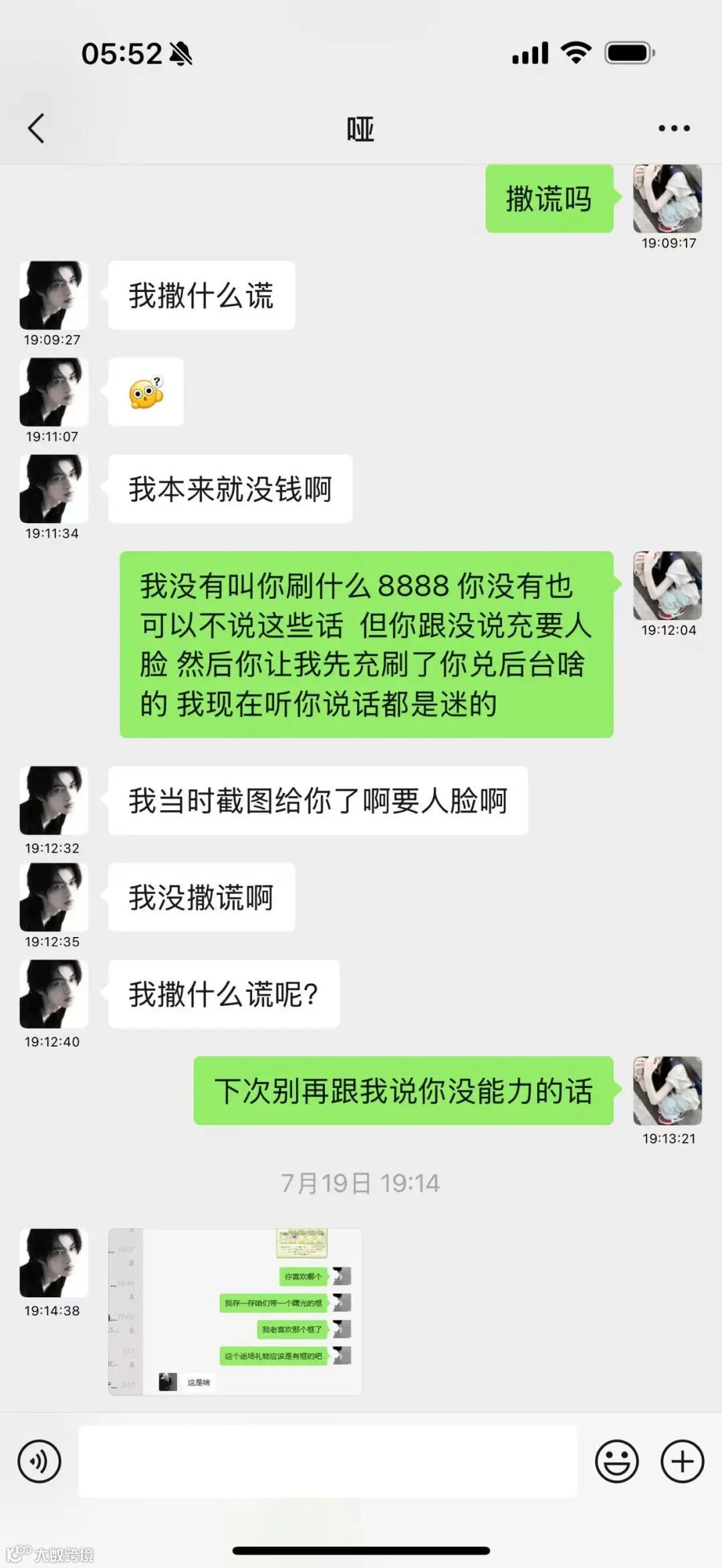 我一点不矛盾 你画饼不是一两次了 刚认识第一个星期 就给我画饼要给我收5200 时候出告白套装七百你都没点 你说要给我刷八千 OK 我说你刷我给你补其它 我第二天都没想起来 你自己问我什么时候刷 随后又说充值要人脸 到晚上我让你给我转5200和1314 你说冬季借的 那不就是你没钱充 说什么需要人脸识别这借口叫我先刷吗 你说充的时候找冬季借了一万 我说给我截图 你说一万的截图没有 6500能截图出来 一万又不能了 那不是撒谎是什么