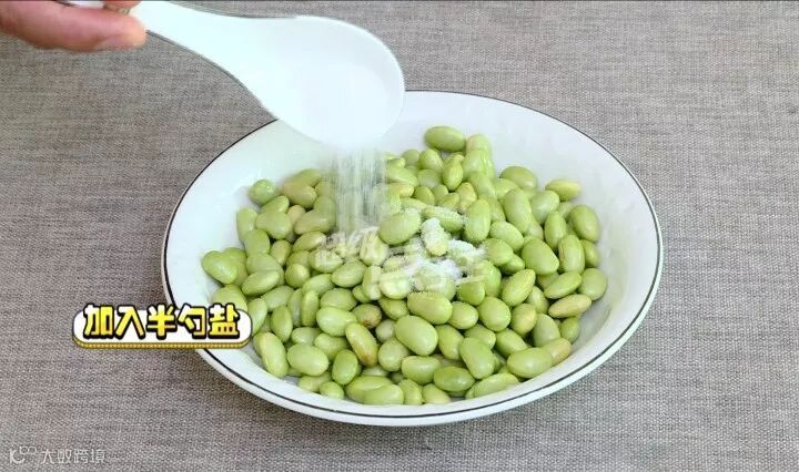 在1斤毛豆里放半勺盐,抓匀后腌制10分钟,这样不仅能去掉豆腥味,还可以给毛豆入底味,炒的时候更入味。▽