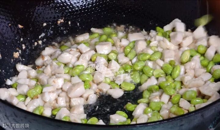 把毛豆下锅爆香,进一步去除它的豆腥味。▽