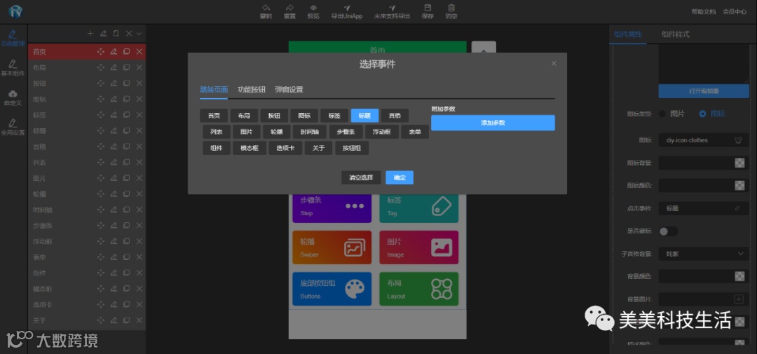基本组件(图文组件、图片轮播、头像图标、字体图标、进度条、视频组件、底部按钮、普通按钮、下拉菜单、倒计时、地图、通知栏、魔方图片、搜索组件、时间轴等)