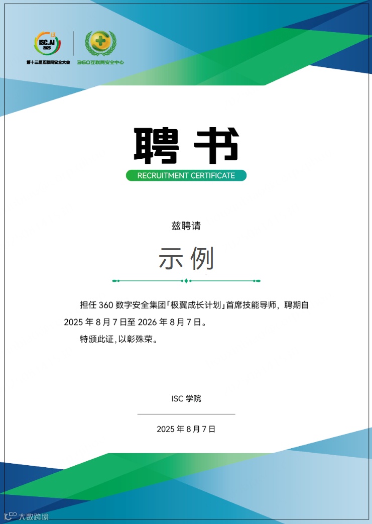 近日,ISC.AI 2025全国信息安全产教融合共同体发展大会上,360正式启动「极翼成长计划」。依托全国安全生态体系,计划在重点省份建立本地化讲师与团队资源,形成“生态+讲师+课程”的高效协作模式。现面向全国,诚挚招募各领域精英讲师,携手赋能高校、企业及政府机构人才培养!