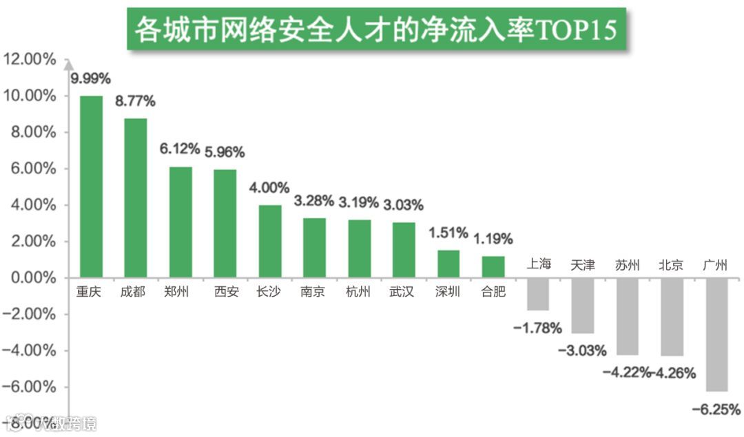 地域流动方面,2019年上半年,重庆、成都、郑州、西安、长沙等城市的网络安全人才净流入率最高,而广州、北京、苏州、天津、上海出现了网络安全人才流失的问题。可见新一线城市对网络安全人才的吸引力逐步提升。