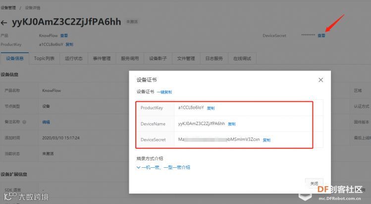 在设备页面查看设备证书信息,填写在代码中对应位置。