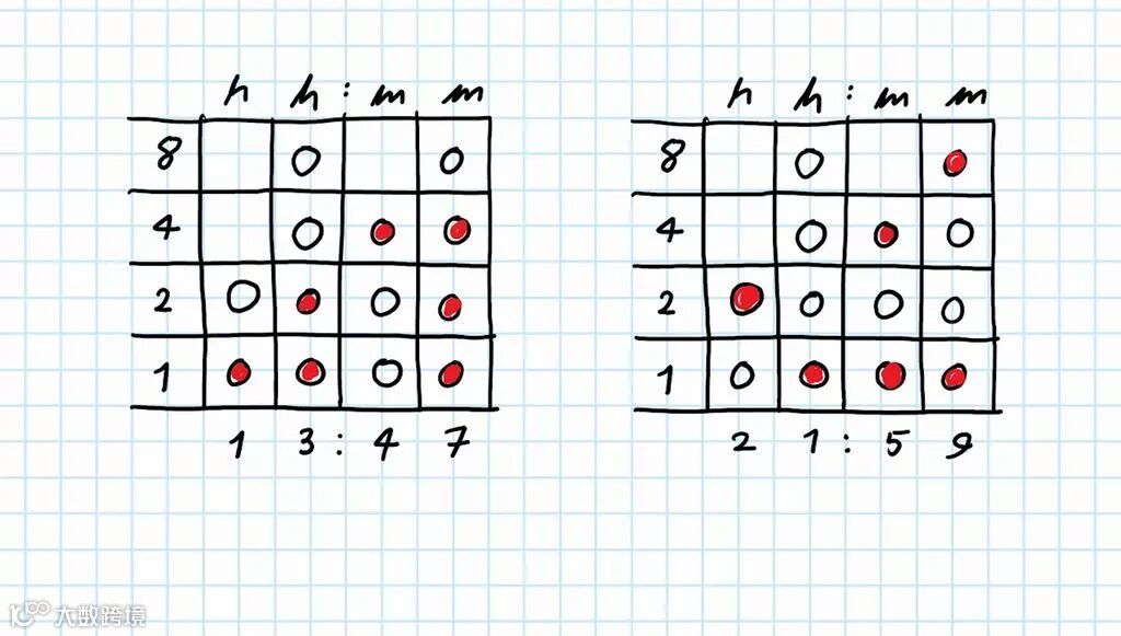 第二步中提到的二进制编码的十进制将十进制位数作为自己的二进制数进行编码。这种情况下的主要好处是在实际情况下查看时间变得容易得多。单独查看每一位时间位数2 (10), 3 (0011), 5 (101), 9 (1001)要比一次性查看完整的数字2359 (100100110111)简单得多。