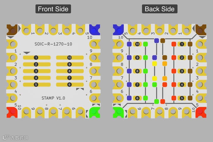 每块 17.8×17.8mm 的方形 Stamp 板都设计用于安装特定类型的表面贴装元件,并通过城堡状引脚接口将元件引脚引出至板边,实现多板无缝连接。