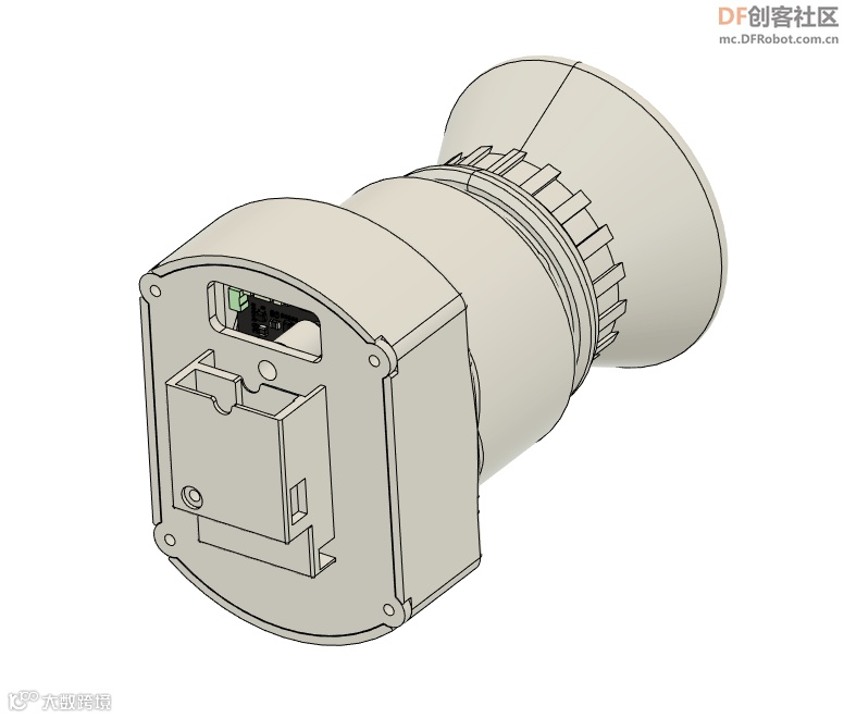 首先,我画了个目镜,把祖传凸透镜装进去了,因为早就想好要做可拆卸的,说不定以后做个显微镜还能用它呢。能看到哈凸透镜和结构之间我给了致死量的蓝丁胶用来固定 & 保护镜头,然后两瓣目镜合起来之后用了两根超长的紧钉螺钉拧死,也比较隐蔽。