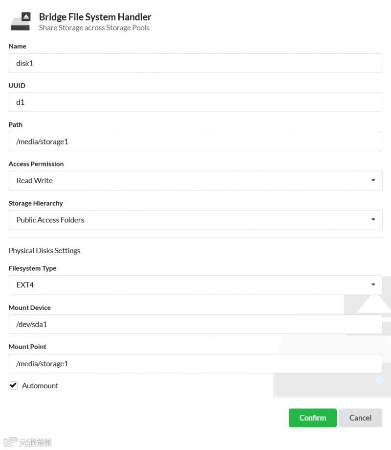 然后转到 ArozOS 的 System Settings > Disk & Storage > Storage Pools,并按如下方式进行设置(请参阅随附的示例配置)。