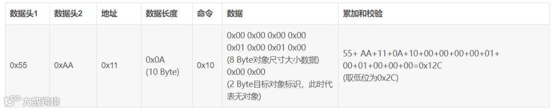 数据长度为10位,数据信息为检测到对象的像素尺寸和对象属性,顺序为:检测对象X点中心低位字节、检测对象X点中心高位字节、检测对象Y点中心低位字节、检测对象Y点中心高位字节、检测对象宽度低位字节、检测对象宽度高位字节、检测对象高度低位字节、检测对象高度高位字节,剩余两个字节为检测到的对象; -