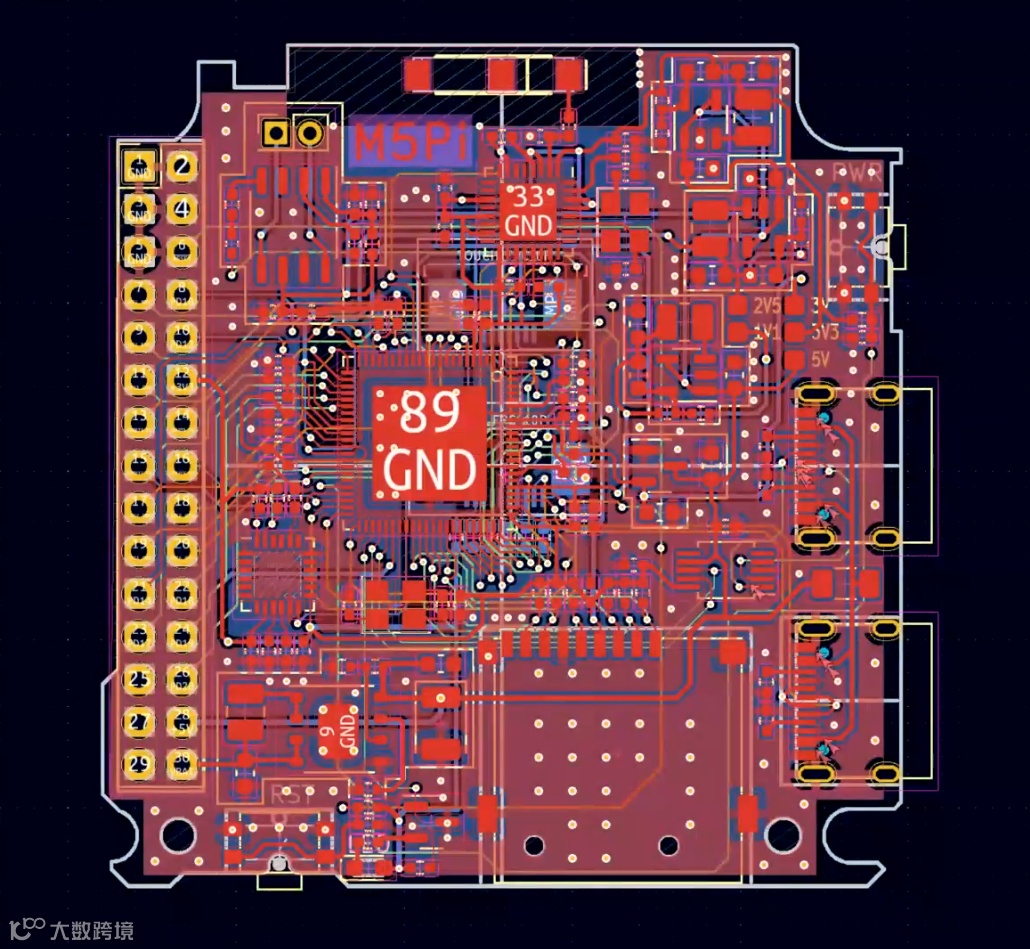自制的M5Pi基于全志科技的F1C200s,内置DDR芯片。画板时即使不顾及高速电路部分也可以简单实现一些想法。板载MPU6050姿态传感器与一块320×240分辨率的2寸全贴合电容触摸显示屏。同时还带有一个1W的小喇叭可以播放声音,Wi-Fi采用ESP8089。