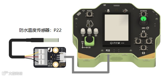 将连接好的防水温度传感器转接板用连接线接到实验盒P22号引脚,如下图所示。