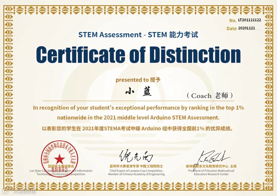 每场STEMA考试成绩超过全国99%考生的学生,及其老师与所在机构将获得中国工程院倪光南院士、普林斯顿多文化教育研究中心及蓝桥杯大赛组委会联合颁布的“TOP1“证书。获奖学生可加入”STEM ONE Society“(顶尖STEM学习社群)。