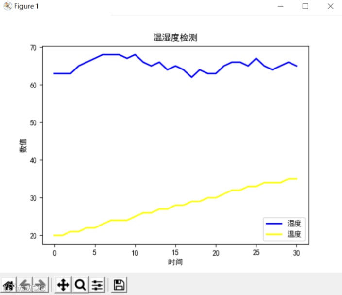 # -*- coding: utf-8 -*-import pandas as pd#导入pandas库并用pd来表示import matplotlib.pyplot as plt#导入matplotlib库中的pyplot绘图模块,并用plt表示data = pd.read_csv("温湿度数据.csv",encoding='gb18030')#导入csv格式表格数据plt.rcParams['font.sans-serif'] = ['SimHei']#设置中文字体plt.title("温湿度检测")#绘制标题plt.ylabel("数值")#绘制x轴标签plt.xlabel("时间")#绘制y轴标签x_data1=data.iloc[:,0]#选取表格第一列并以此作为折线1的x轴数据y_data1=data.iloc[:,1]#选取表格第二列并以此作为折线1的y轴数据x_data2=data.iloc[:,0]#选取表格第一列并以此作为折线2的x轴数据y_data2=data.iloc[:,2]#选取表格第三列并以此作为折线2的y轴数据plt.plot(x_data2,y_data2,color='blue',label="温度",linewidth=2.0)#绘制折线,并设置折线的颜色、标签、线宽plt.plot(x_data1,y_data1,color='yellow',label="湿度",linewidth=2.0)#绘制折线,并设置折线的颜色、标签、线宽plt.legend()#显示图例(标签)plt.show()#显示图像