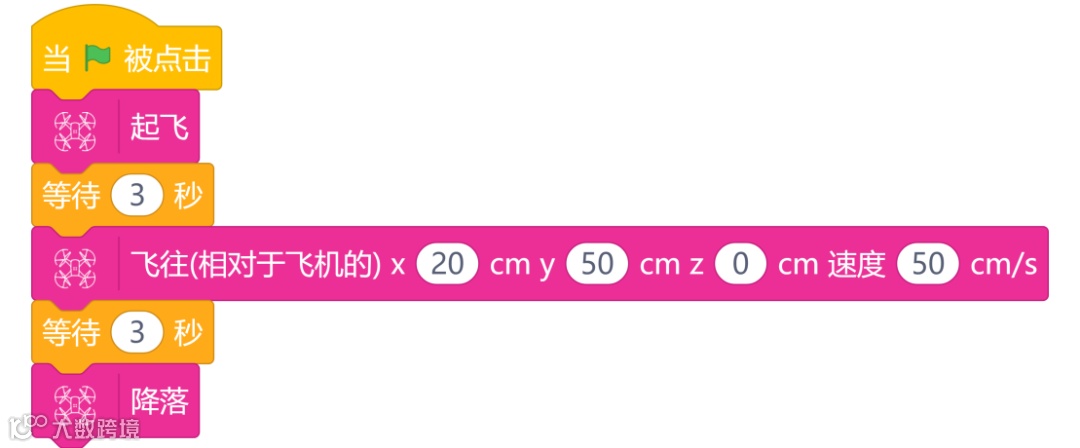 指定位置降落则是使用飞往坐标指令(x代表前后,y代表左右,z代表上下)与降落指令结合。完成指定位置降落。