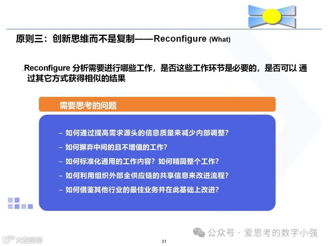 根本性再思考:颠覆“按部门分工” 的传统假设,如重新设计订单审批流程,取消非增值的多层级签字,改为基于数据的自动化审核。