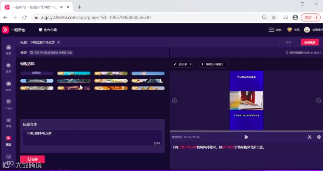 如果想搜索“金融”相关的素材,在在线素材搜索栏中,输入关键词“金融”,点击搜索。也可以用“AI帮写”,在AI帮写的输入栏中,输入关键词“预测下白酒下周走势”,选择“通用“行文风格,文案长度选择“短”,点击生成文案。