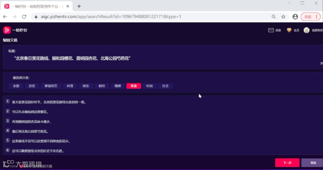 针对于风景类的素材,可以用“AI帮写“写一个文案。在AI帮写的输入栏中,输入关键词“北京的赏花路线”,选择“通用“行文风格,文案长度选择“短”,点击生成文案。