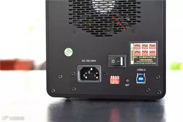 背面的接口分别为电源接口、开关、阵列组合开关、SET按键以及USB3.0接口。在阵列模式的组合上,ORICO设计成拨动按钮组合的方式。