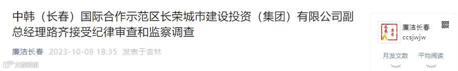据中韩(长春)国际合作示范区纪检监察工委消息:中韩(长春)国际合作示范区长荣城市建设投资(集团)有限公司副总经理路齐涉嫌严重违纪违法,目前正接受中韩(长春)国际合作示范区纪检监察工委纪律审查和监察调查。