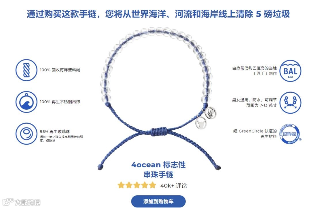 另外,服装、饰品等卖家可以在商品详情页内增加产品可持续性、环保等材质说明,尤其是品牌卖家,在独立站设置公益事件宣发板块、产品可持续性发展介绍十分必要,此前Shoptop分析的将海洋垃圾变废为宝的品牌4Ocean,正是如此。(可点击查看详情)