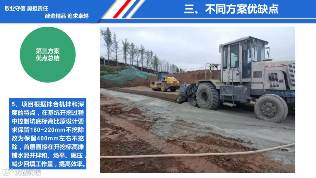 陕建工程四部第六分公司施工的天水市西交康桥中学项目是工程四部首次进行水泥土换填施工,在施工准备阶段,项目部经过充分策划,采取了多方案比选方式,全面考虑了成本、工序、工艺、效率、机械设备选型等问题,选择了最合理、效率最高的专业化机械拌和、摊铺方案。施工速度最快达到5475㎡/天,施工进度快、质量好,经济效益明显。