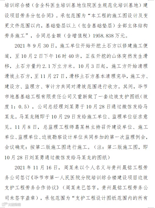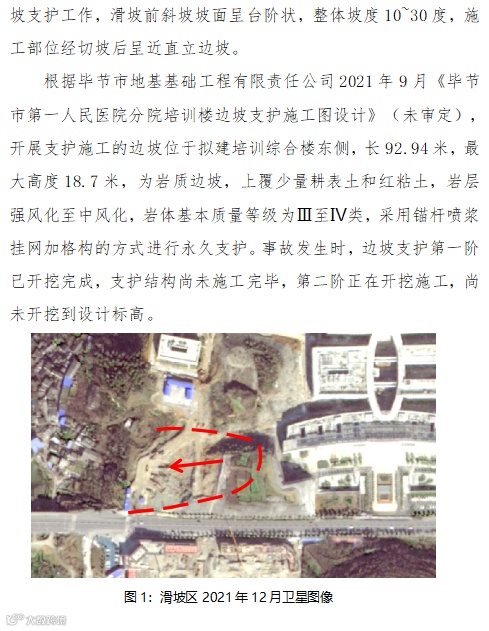 2022年1月3日18时55分许,贵州省毕节市金海湖新区归化街道办事处香田村在建的毕节市第一人民医院分院培训综合楼边坡支护工程在施工过程中,突然发生山体滑坡,最终造成14名施工作业人员死亡、3人受伤。