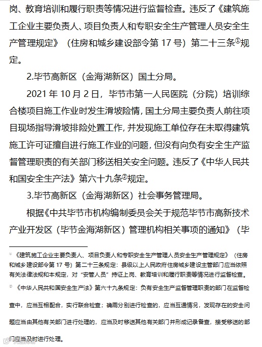 此外贵州建X集团有限公司、绿X大基建集团有限公司等管理单位,毕节高新区(金海湖新区)城乡建设局、毕节高新区(金海湖新区)国土分局、毕节高新区(金海湖新区)社会事务管理局、毕节市住房和城乡建设局、毕节市卫生健康局、毕节市国资委等有关部门单位以及金海湖新区归化街道办事处党工委、街道办事处、党工委、管委会、毕节市人民政府等地方党委政府在履行安全监管职责方面均存在一定问题。