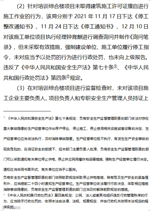 明知培训综合楼建设项目未取得施工许可、边坡设计未送审,对施工单位采用白图施工行为未制止,也未向有关部门报告。