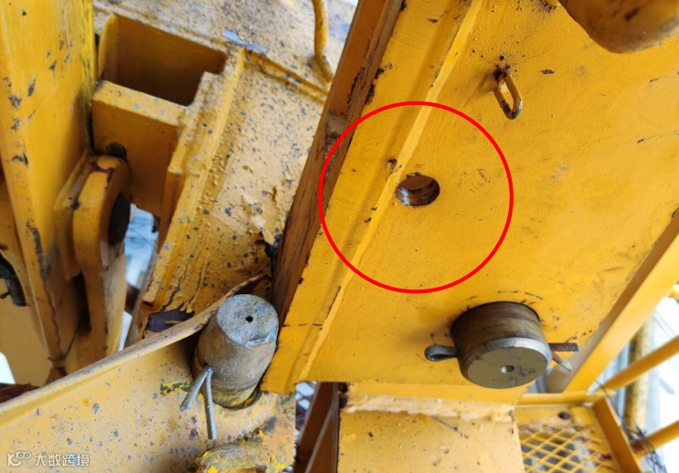 2.塔机套架座落于附着装置标准节抱框上(见图2);套架与回转下支座连接耳板中,西北侧一处耳板有明显变形(见图3),其余耳板无异常;套架有3层工作平台,在顶层及中间层工作平台上有回转下支座与套架连接销轴、标准节连接销轴及铁锤等物件(见图4);套架上的顶升油缸呈伸出状态(见图5),经测量,缸筒端面至油缸下端固定销轴下部的距离为960mm;顶升油缸下端横梁的东西两侧均未见防脱插销(见图6、图7);塔身标准节与套架导轮接触处有刮擦痕迹(见图8)。