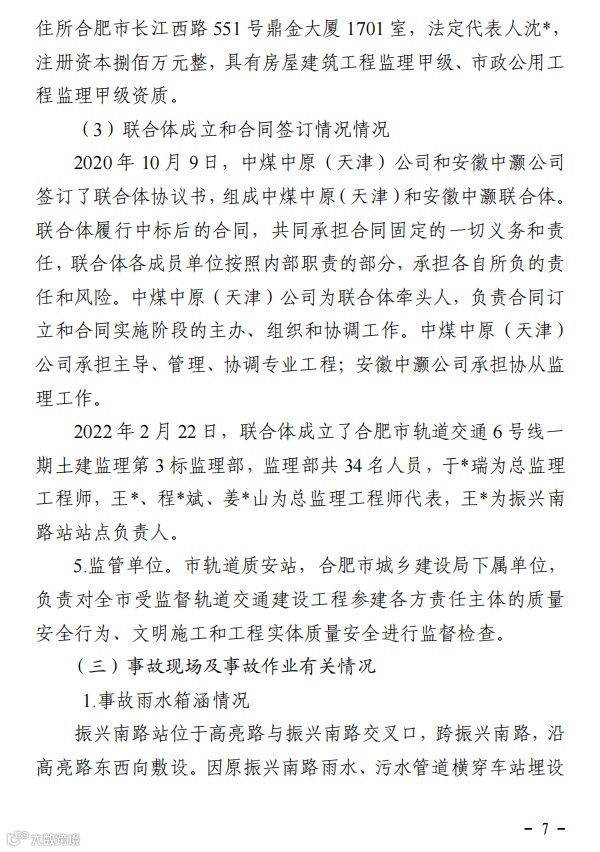 2022年2月25日14时50分左右,合肥市轨道交通6号线一期土建施工总承包3标项目的振兴路站雨水箱涵破除施工时,发生一起沟槽坍塌事故,造成1人死亡。