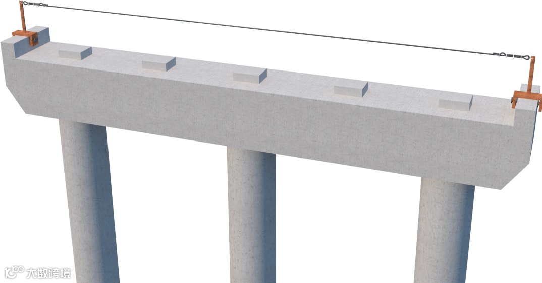 横梁区域操作平台作业面周边防护栏杆无法满足高度要求时,在横梁上设置膨胀螺栓,悬挂钢丝绳或锦纶安全绳作为垂直生命线。