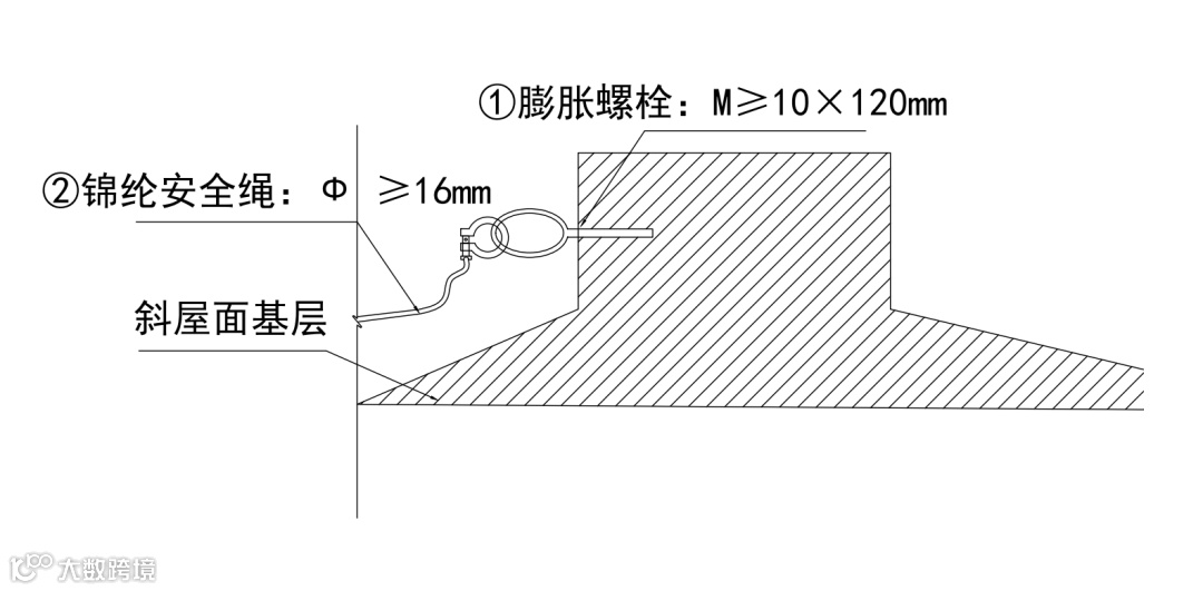 在斜屋面顶部安装膨胀螺栓,将安全绳固定在螺栓端部圆环处,或者将安全绳固定在斜屋面顶部结构上,安全绳沿斜屋面竖向布置,工人安全带通过自锁器系挂在安全绳上。