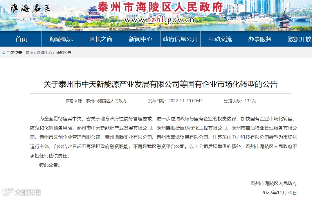 为全面贯彻落实中央、省关于地方政府性债务管理要求,进一步厘清政府与国有企业的权责边界,加快国有企业市场化转型,防范和化解债务风险,泰州市中天新能源产业发展有限公司、泰州鑫顺德园林绿化工程有限公司、泰州市鑫海物业管理服务有限公司、泰州市文创企业管理有限公司、泰州道腾实业有限公司、泰州市嘉途贸易有限公司、江苏东山电力科技有限公司转型为市场化运行主体,自公告之日起不再承担政府融资职能,不再是我区融资平台公司。以上公司后续举借的债务,泰州市海陵区人民政府不承担任何偿债责任。