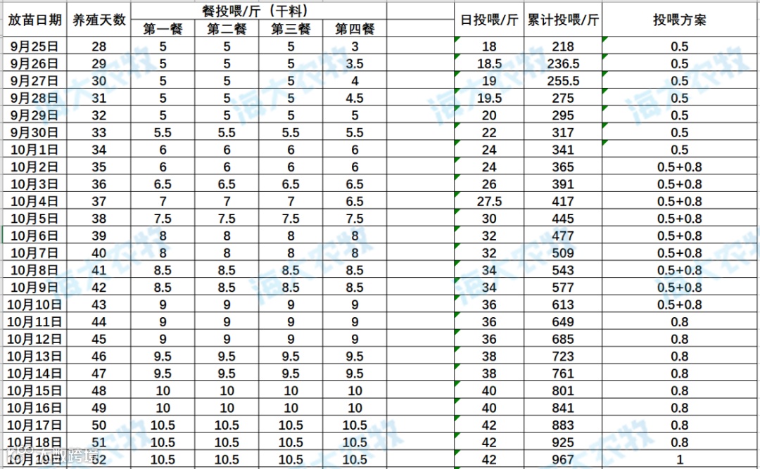 高密度4餐投喂,目的是快速增加日投喂量达到顶投。从0.5料开始,30天左右开始转为4餐投喂,起投量5斤/餐。每次加料需要至少2天的时间来稳定投喂,整体加料速度更快。如果出现肝脏和水质问题恢复到3餐。