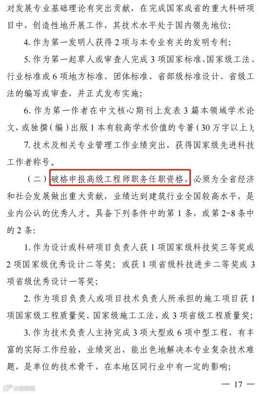 二、破格申报高级工程师和工程师职务任职资格条件,详见下方文件原文(P17-P19)。