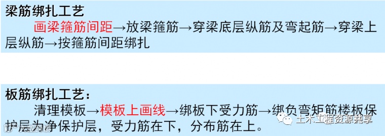 4)板、次梁与主梁交叉处,板的钢筋在上,次梁的钢筋居中,主梁的钢筋在下;当有圈梁或垫梁时,主梁的钢筋应放在圈梁上。主筋两端的搁置长度应保持均匀一致。
