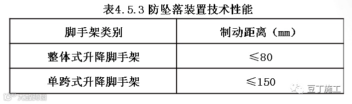 3、防坠落装置技术性能除应满足承载力要求外,还应符合表4.5.3的规定。