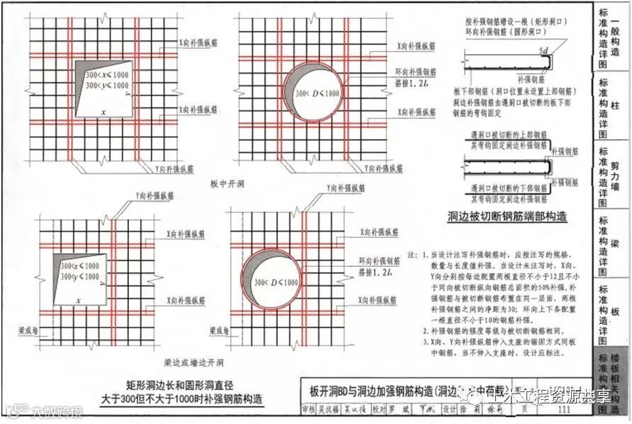 (7)洞口加筋要求:凡是洞口墙筋截断处加三边开口箍筋。并按图纸要求附加洞口加筋。
