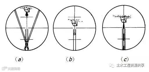 瞄准目标时要用十字丝的中央部位。如观测水平角,可视目标影像的大小情况,将目标影像夹在双纵丝内且与双丝对称,或用单纵丝与目标重合,如上图所示。为了减少目标倾斜对水平角的影响,如上图(b)、(c)的情况,应尽可能瞄准目标底部。如用垂球线作为找准的目标,应注意使垂球尖准确对正测点,并瞄准垂球线的上部,如上图(a) 。