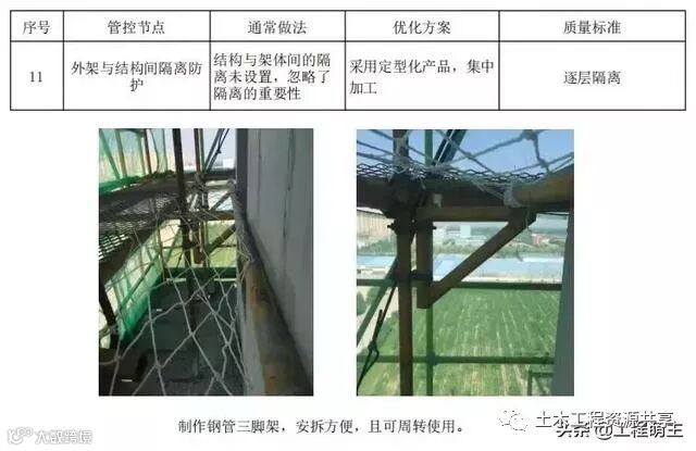 脚手架搭设采取劳务分包形式,搭设细节缺少关注,过程中通常出现下列问题: 1、现场使用材料规格数量审核不严,进场材料过多或规格不全,影响外架整体进度及形象。 2、管控节点不清晰,验收程序走过场。